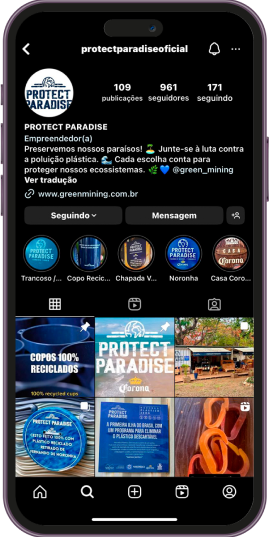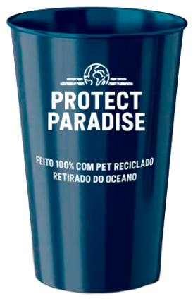 Chega de plástico virgem em eventos! O copo Protect Paradise começa com coletas de resíduos no litoral brasileiro. As garrafas PET de 2 litros que são coletadas passam então por duas usinas para reciclagem e fabricação dos copos, que ganham impressão personalizada de acordo com cada cliente. Festivais, shows, jogos e outros grandes eventos podem utilizar os copos, e o público os leva para casa para reuso.